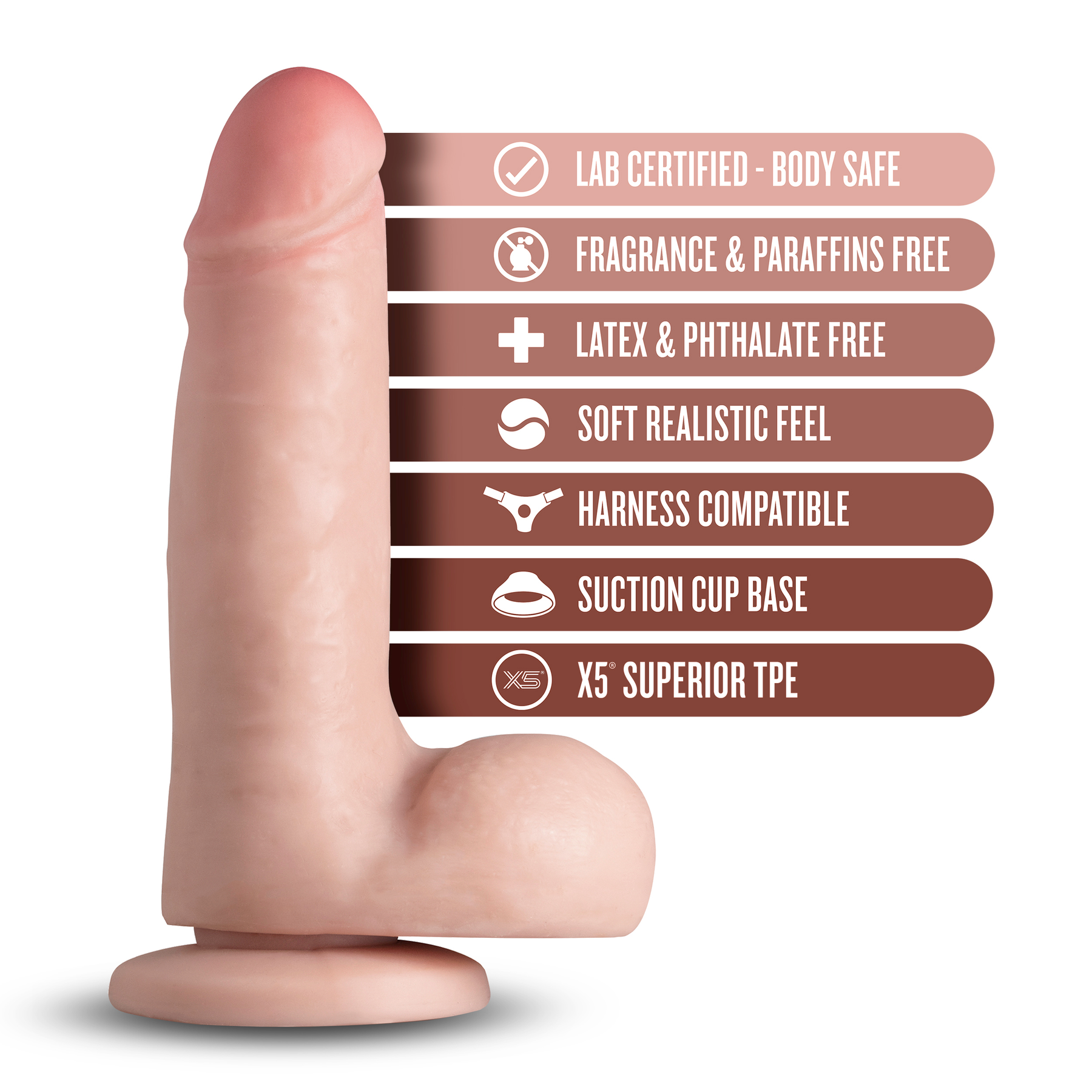The five inches of insertable length give her enough to feel completely taken care of without ever feeling like too much. The realistic sculpt means the sensation changes as she moves, giving her that natural variation that keeps arousal building instead of plateauing. The suction cup base opens up hands-free possibilities on any smooth flat surface, and harness compatibility means this can work for both of you in ways that go well beyond solo play. The TPE material is soft, warm to the touch, and completely free of phthalates, latex, fragrance, and paraffins, so what she feels good is also genuinely safe.