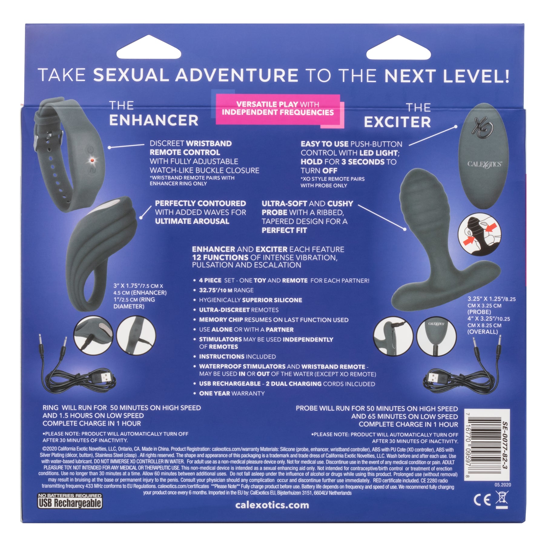 Functions: 12 vibration, pulsation, and escalation functions per toy Remote Range: 32.75 feet Run Time (High Speed): 50 minutes for both the probe and ring Run Time (Low Speed): 65 minutes for probe, 1.5 hours for ring Charge Time: 1 hour Power: USB rechargeable, 2 dual charging cords included Waterproof: Yes (stimulators and wristband remote; XO remote excluded) Material: Silicone What's Included: Silicone probe with wristband remote, vibrating cock ring with handheld remote, 2 dual USB charging cords, instructions Auto Shutoff: 30 minutes of inactivity Memory Function: Resumes on last function used Warranty: One year